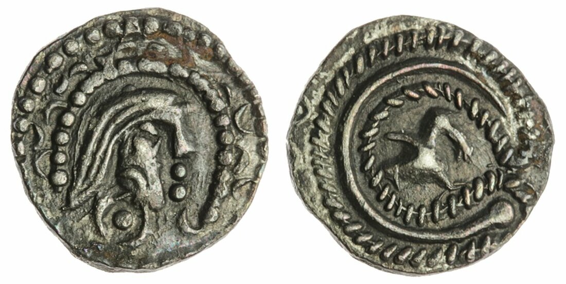 Anglo-Saxon England, Secondary Series (710-760), Sceat, Series O, type 38, Mint in East Kent, bust right, snub nose descending from hairline, swept back hair or perhaps a helmet with nasal, pincer shoulder (an ornament ?) breaking beaded border, rev. small bird flying right, fish in beak, stitched double torc, enclosing boss-headed snake anticlockwise, vestigial outer blundered legend or cable border, torc anticlockwise, 1.00g, 270° (SL 58-20; SCBI 69, 585 this coin; North 95; Spink 807 plate coin), darker cabinet tone with traces of rust, otherwise good very fine and very rare