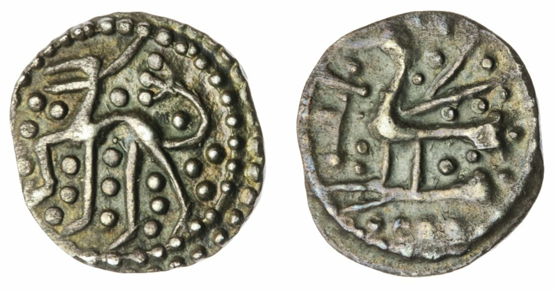 Anglo-Saxon England, Secondary Series (710-760), Sceat, Series QIID variety, quadruped left, looking forward, angular foreleg and trefoil tail raised, pellet filled field, rev. sea bird or eagle left, feet splayed, trampling linear serpent, wedge-shaped tail, forked wing raised, cross pommée before, pellets in field, 1.00g, 180° (SL 64-110; SCBI 69, 636 this coin; T&S pp. 495-6, 386-7; Gannon: 134, 151 n. 305, 191-2, Fig. 4.7b, Fig. 4.30, Fig. 4.38a; MEC 8 Series Qb; North –; Spink 809), slightly waterworn on reverse, otherwise toned, a really good very fine, very rare