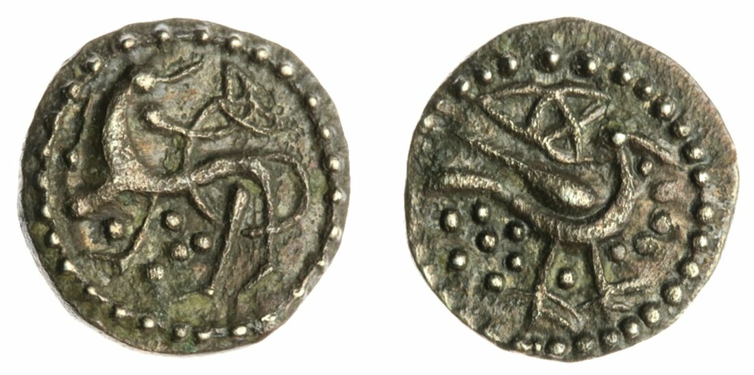Anglo-Saxon England, Secondary Series (710-760), Sceat, Series QIIIA, type 64, sinuous quadruped left, looking back and up, tail rising clockwise between hind legs to form triquetra above, foreleg raised, angular feet, pellets in field, rev. sea bird or eagle right, looking forward, splayed feet, pellets before, rosette behind, triquetra above, 1.00g, 0° (SL 2, 65-20; SCBI 69, 640 this coin; Spink 810A plate coin; T&S pp. 495-6, 386-7; Gannon: 134, 151, no. 305, 191-2, and Figs. 4.7b, 4.30, and 4.38a; MEC 8 Series Qc; North 139; Spink 810), well centred, with only faint traces of porosity, nevertheless a really bold very fine, very rare