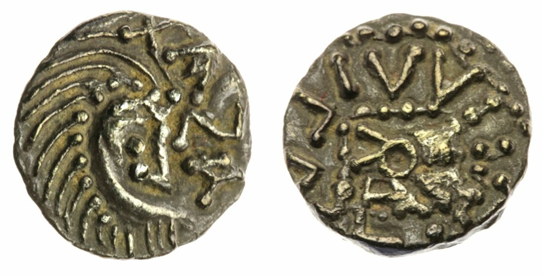 Anglo-Saxon England, Continental Phase (695-740), Sceat, Series E, variety "G5", quilled crescent curved right, enclosing "Moon face" right, XAZA before (cf Series E variety G4), rev. legend reading VVILL[…] retrograde around beaded standard enclosing crosier and Y-shaped element, pelleted tufa below, 1.10g, 180° (SL 89-50; SCBI 69, 216 this coin; Abramson 2008, Fig 17; Abramson, 2012b, Fig 15a; cf. BMC type 10; SEMC2, T&S pp. 243-45, 258-62; JMP 96-7; Gannon 161, Fig. 5.6a; Spink 790G plate coin), slightly porous with darker cabinet tone and deposits in recesses, a really bold very fine, extremely rare