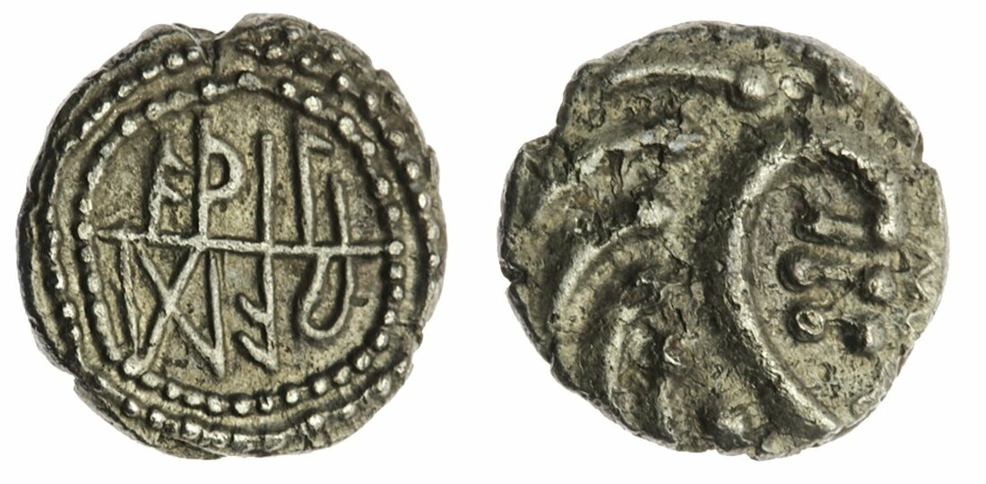 Anglo-Saxon England, Primary Series, temp. Æthelred of Mercia (675-704), Sceat, "Series E", type 105, runic ÆTHILI | RÆD in two lines either side of base line (not boustrophedon), triple beaded border, rev. quilled crescent with pellet head, coiled right, enclosing three bars, with wavy exergual line, 1.12g, 0° (SL 92-10; SCBI 69, 295 this coin; North 155; Spink 780), small edge chip and slightly porous surfaces, otherwise well centred, a really bold very fine, the reverse less so, rare