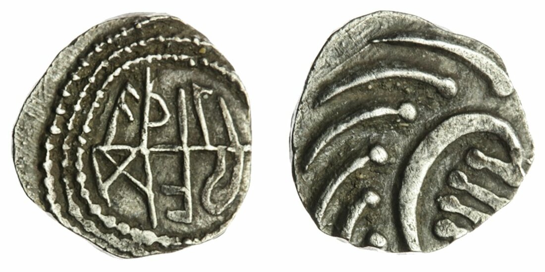 Anglo-Saxon England, Primary Series, temp. Æthelred of Mercia (675-704), Sceat, "Series E", type 105, runic ÆTHILI | RÆD in two lines either side of base line (not boustrophedon), triple beaded border, rev. quilled crescent with pellet head, coiled right, enclosing four bars, 1.14g, 90° (SL 92-10; SCBI 69, 296 this coin; North 155; Spink 780), slightly off-struck on obverse, otherwise lightly toned, about very fine, a bolder very fine, rare