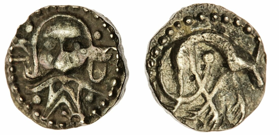 Anglo-Saxon England, Primary Phase (680-710), Sceat, Series Z, type 66, Christ facing with prominent cheeks, bell-shaped hair style curling outward, long downswept moustache and beard forked into W-shape, pellets either side of head and beard, rev. long-legged hound or wild boar prancing right, legs cross, large claws below, lowered tail with pellet finial rises below body, ears erect, 1.20g, 0° (SL 102-40, plate coin; SCBI 69, 118 this coin), heavy obverse die crack, otherwise toned with only faint traces of waterwear, very fine, the reverse better, rare