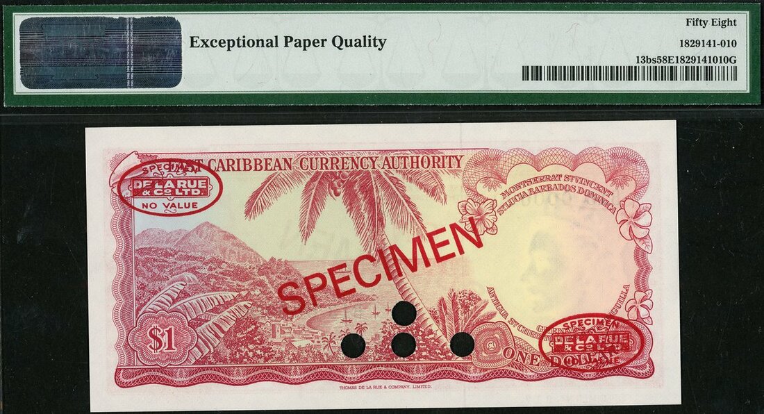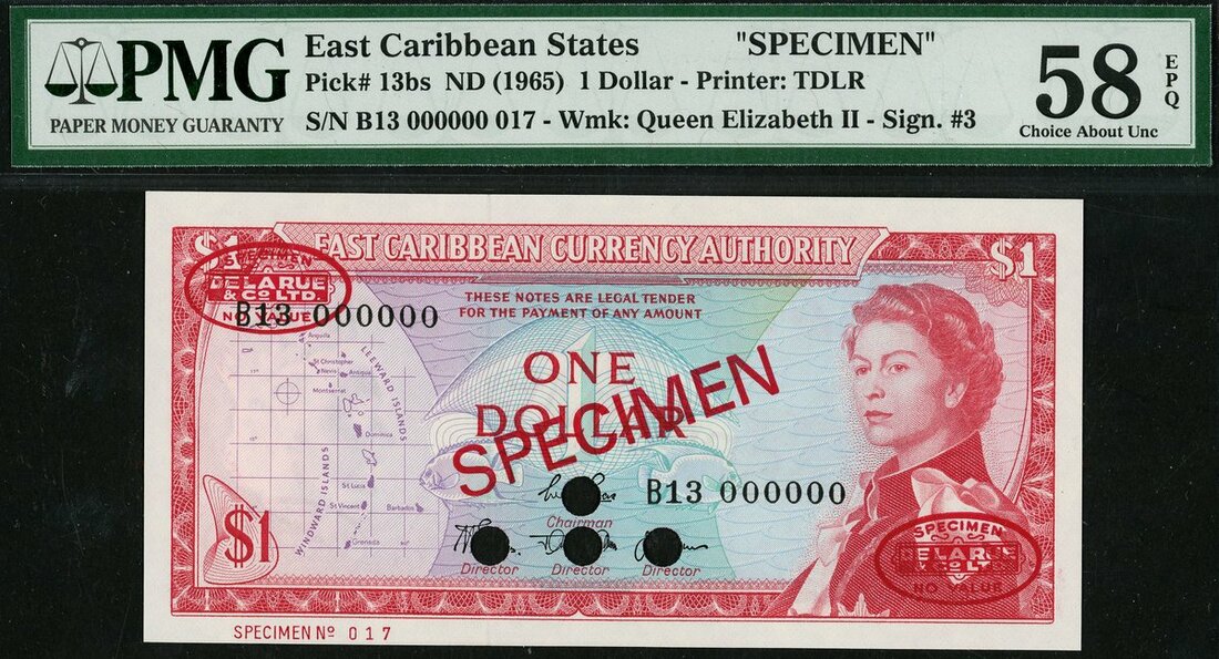 East Caribbean Currency Authority, specimen $1, ND (1965), prefix B/13, (Pick 13bs, TBB B101s), in PMG holder 58 EPQ Choice About Unc