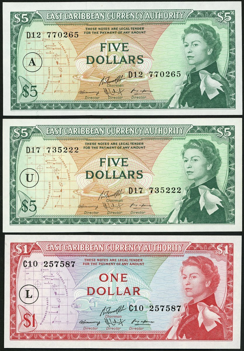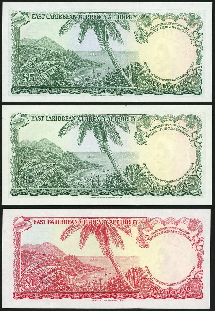 East Caribbean Currency Authority 5 dollars (2), 1 dollar, ND (1983), (Pick 13i, 14i,o, TBB B101cl, B102ca,cu), 5 dollar about uncirculated, 1 dollar uncirculated (3 notes)