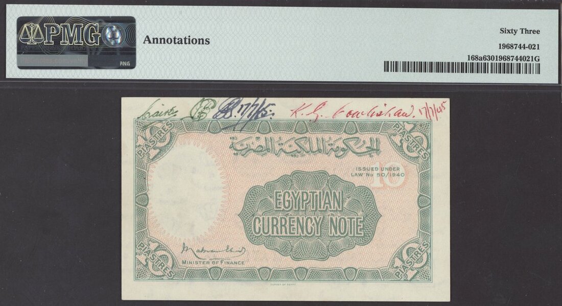 Egyptian Government, 10 piastres, 1940, serial number F/4 363824, (Pick 168a), in PMG holder 63 Choice Uncirculated