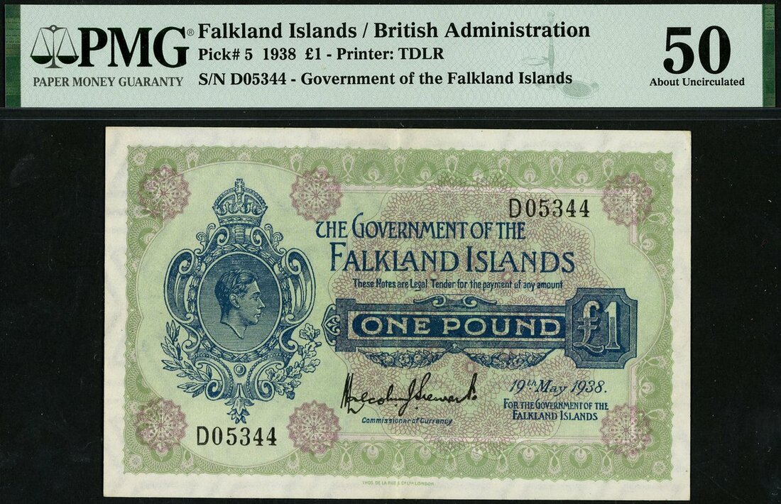 Government of the Falkland Islands, £1, 19 May 1938, serial number D 05344, blue, green and lilac, crowned portrait of George VI at left, value in blue tablet at right, printed signature of Malcolm Stewart, reverse blue, guilloche patterns