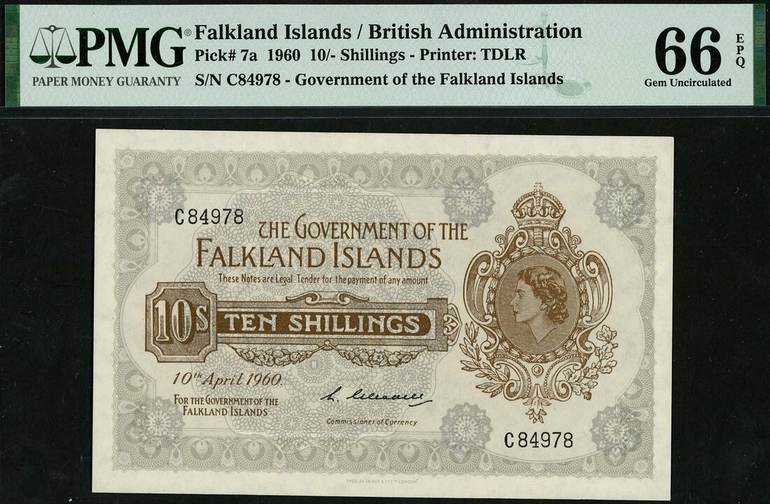 Government of the Falkland Islands, 10 shillings, 10 April 1960, serial number C 84978, pale grey, crowned vignette of Elizabet II in brown at right, value in brown tablet at left, signature of Leslie Gleadell, reverse pale brown guilloche patterns