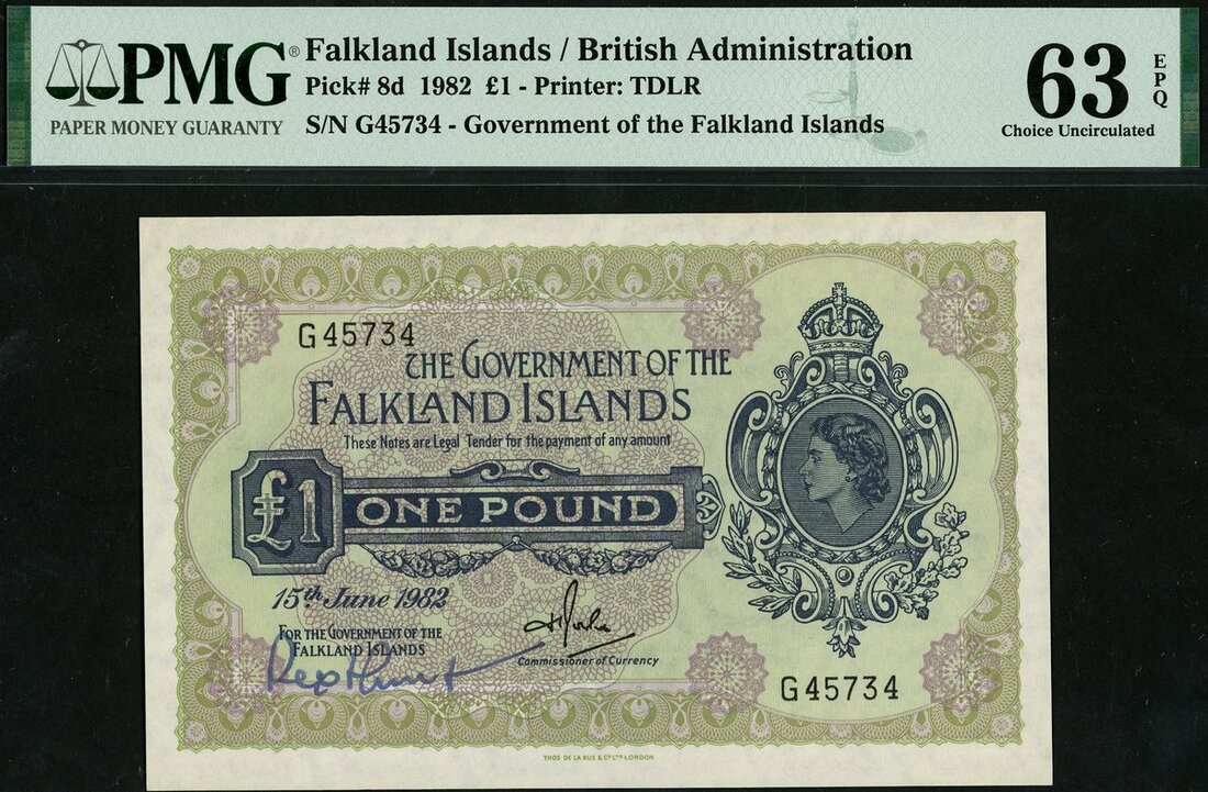 (Pick 8d, TBB B213d), manuscript signature of Rex Hunt, the Governor of the Falkland Islands during the Falklands War. Rex Hunt signed four notes all dated 15 June 1982, the day of the surrender of the Argentine forces, in PMG holder 63 EPQ Choice Uncirculated, unusual and interesting