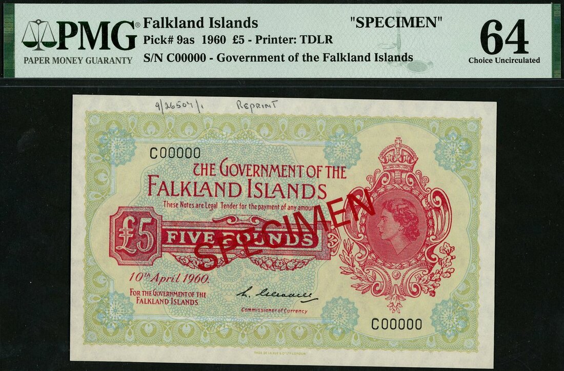 Government of the Falkland Islands, specimen £5, 10 April 1960, serial number C 00000, green, pale yellow, crowned portrait in red of Elizabeth II at right, value in red tablet at left, printed signature of Harold Rowlands, reverse pale pink-red, guilloche patterns