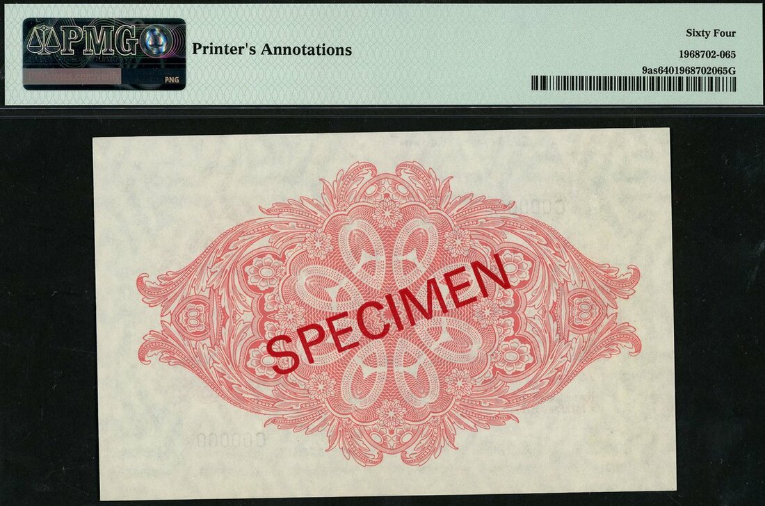 (Pick 9as, TBB B214as), in PMG holder 64 Choice Uncirculated, annotation in top margin 'Reprint', red SPECIMEN overprint, due to a shortage of £5 instructions were given to the printers to 'reprint', rare