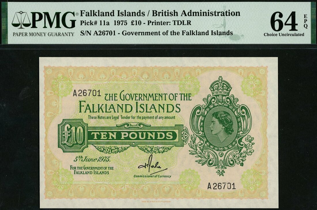 Government of the Falkland Islands, £10, 5 June 1975, serial number A 26701, green, pale pink and pale orange, crowned portrait in green of Elizabeth II at right, value in green tablet at left, printed signature of Harold Rowlands, reverse green, guilloche patterns