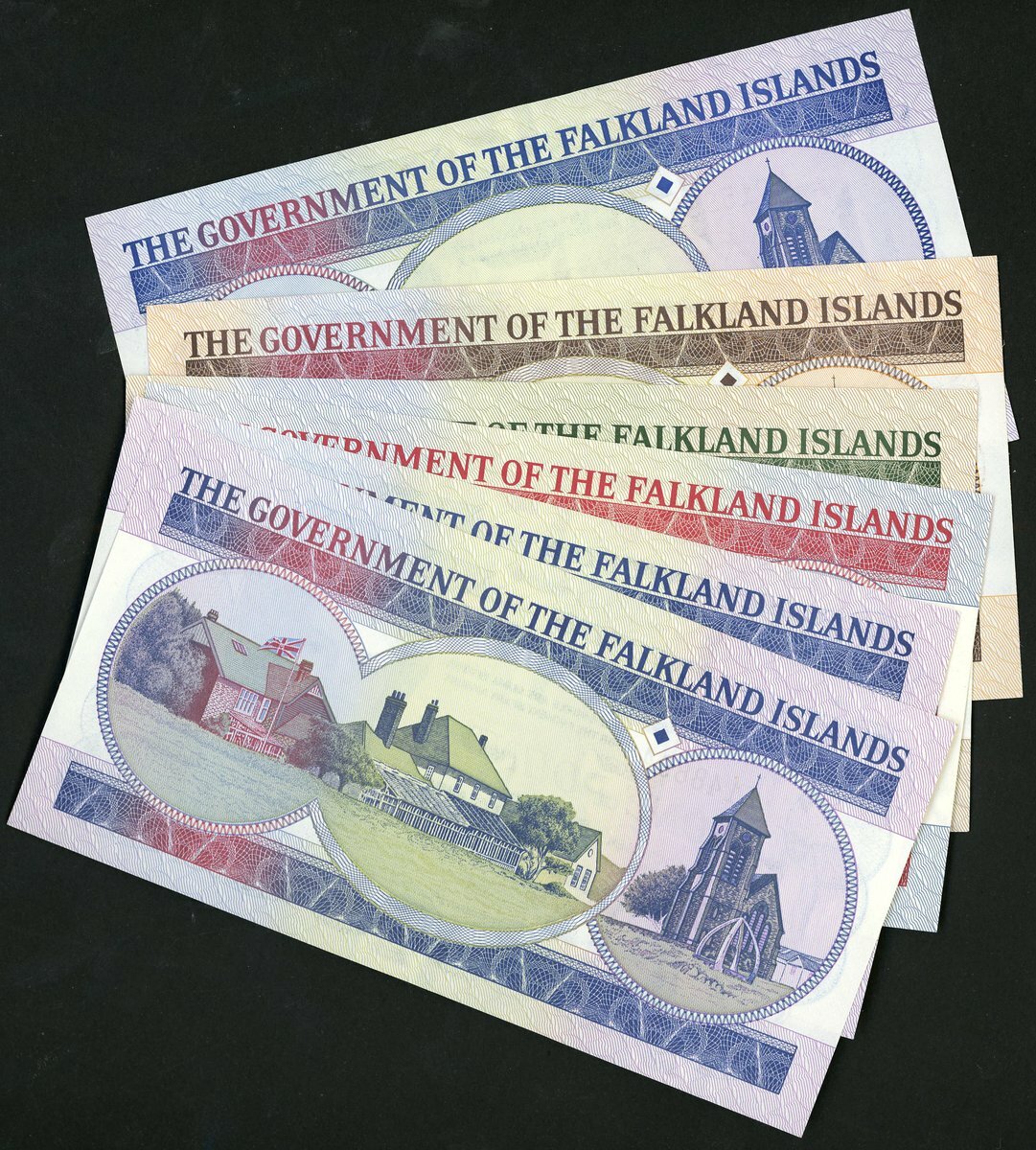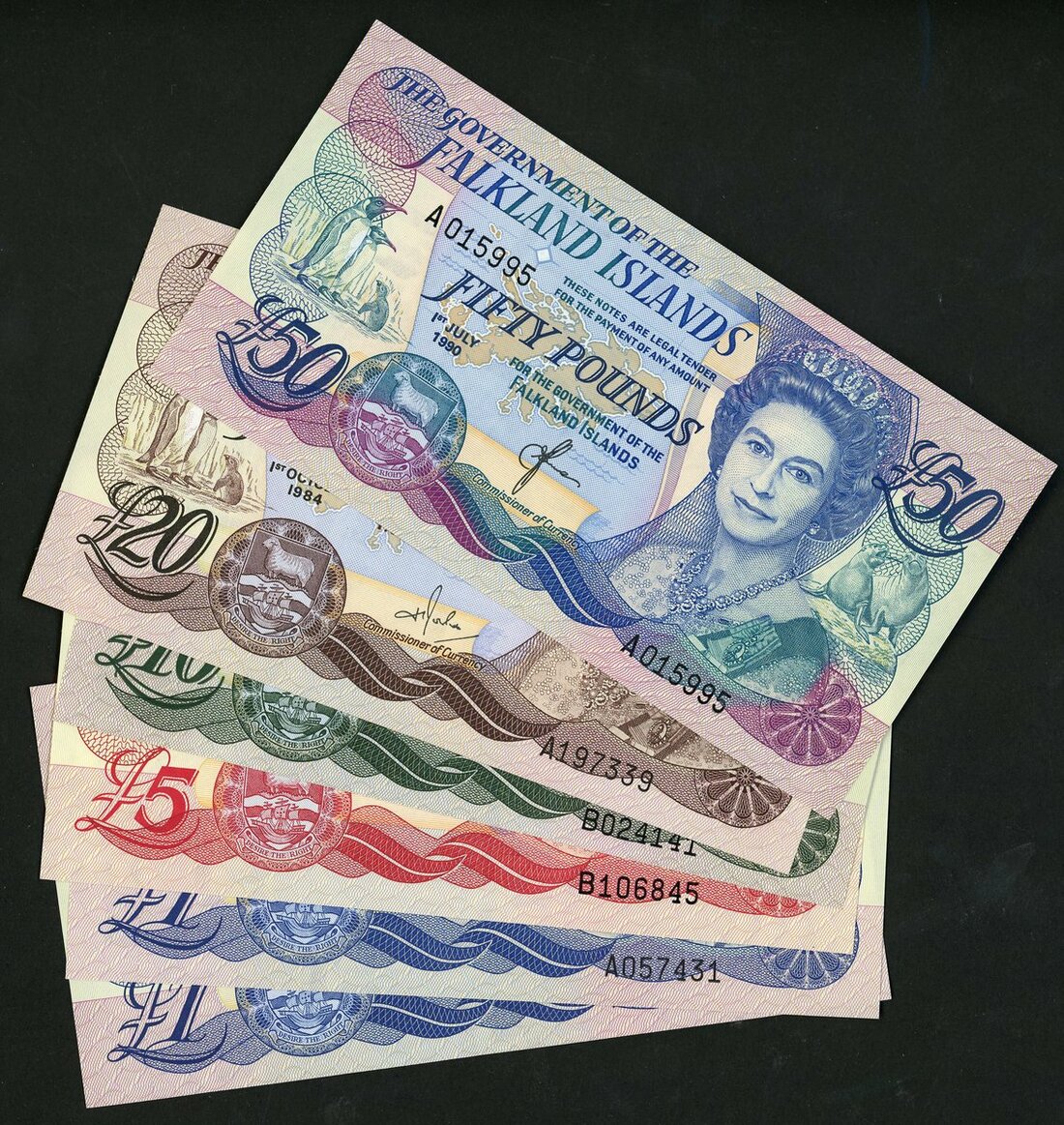 Government of the Falkland Islands, £1 (2), 1984, both prefix A, blue, £5, 2005, prefix B, red, £10, 2011, prefix B, green and £20, 1984, prefix A, brown, also £50, 1990, prefix A, blue and purple, all Elizabeth II and arms in field
