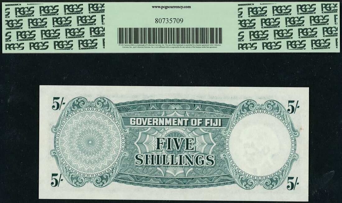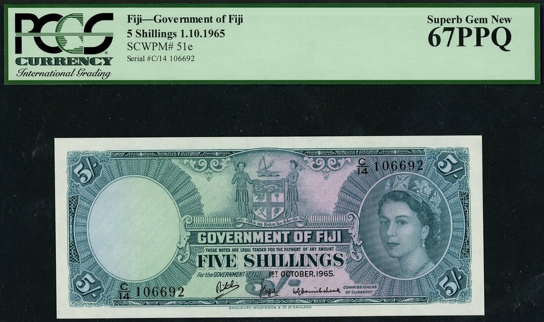 Government of Fiji, 5 shillings, 1 October 1965, serial number, (Pick 51e, TBB B328e), in PCGS holder 67 PPQ Superb Gem New