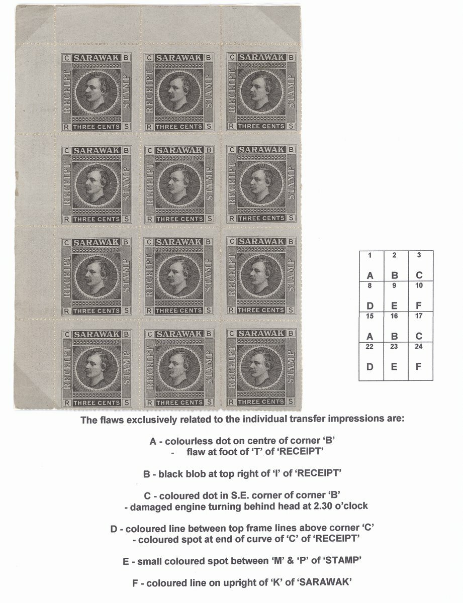 3c. black on grey, an unused study of the transfer types, all neatly mounted and written-up on five pages, comprising a top left corner block of twelve (3x4) with impressions A to F repeated twice, a top right corner block of sixteen (4x4) with impressions G to J repeated three times (first, third and fourth rows) and impressions A, B, C and G on the second row, a top right corner block of six (3x2), marginal strip of three and six singles, one showing abnormal perforations and one showing part of papermaker's watermark (Transfer H No. 26); condition a little mixed as to be expected with this issue. Barefoot 1, £1,505