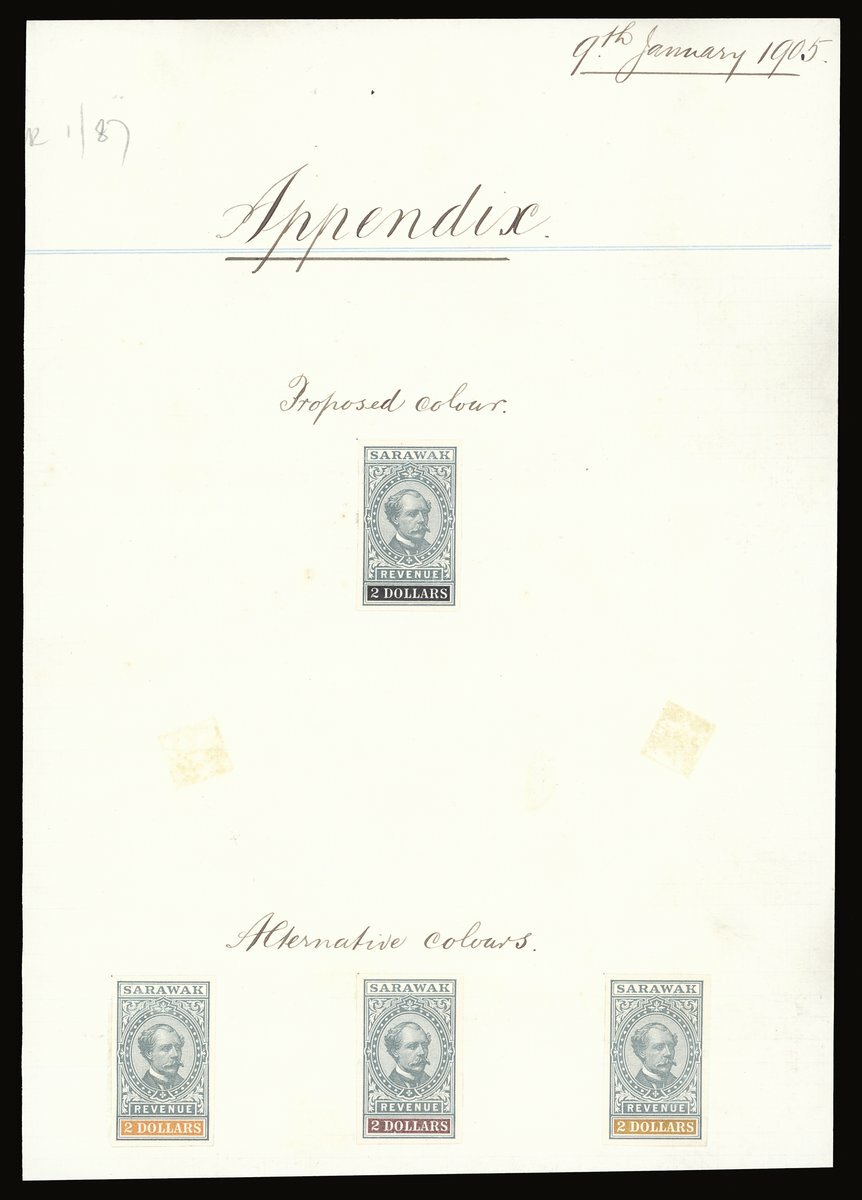 "Appendix" sheet (157x225mm.) dated "9th January 1905" for the proposed new $4 value, bearing $2 imperforate colour trials (4), one marked "Proposed colour" in dull green and black, and three marked Alternative colours" in dull green with value tablets in orange, purple and in ochre, fine
