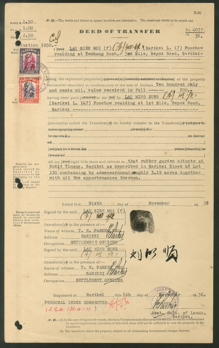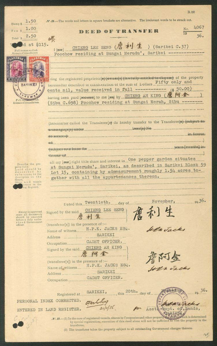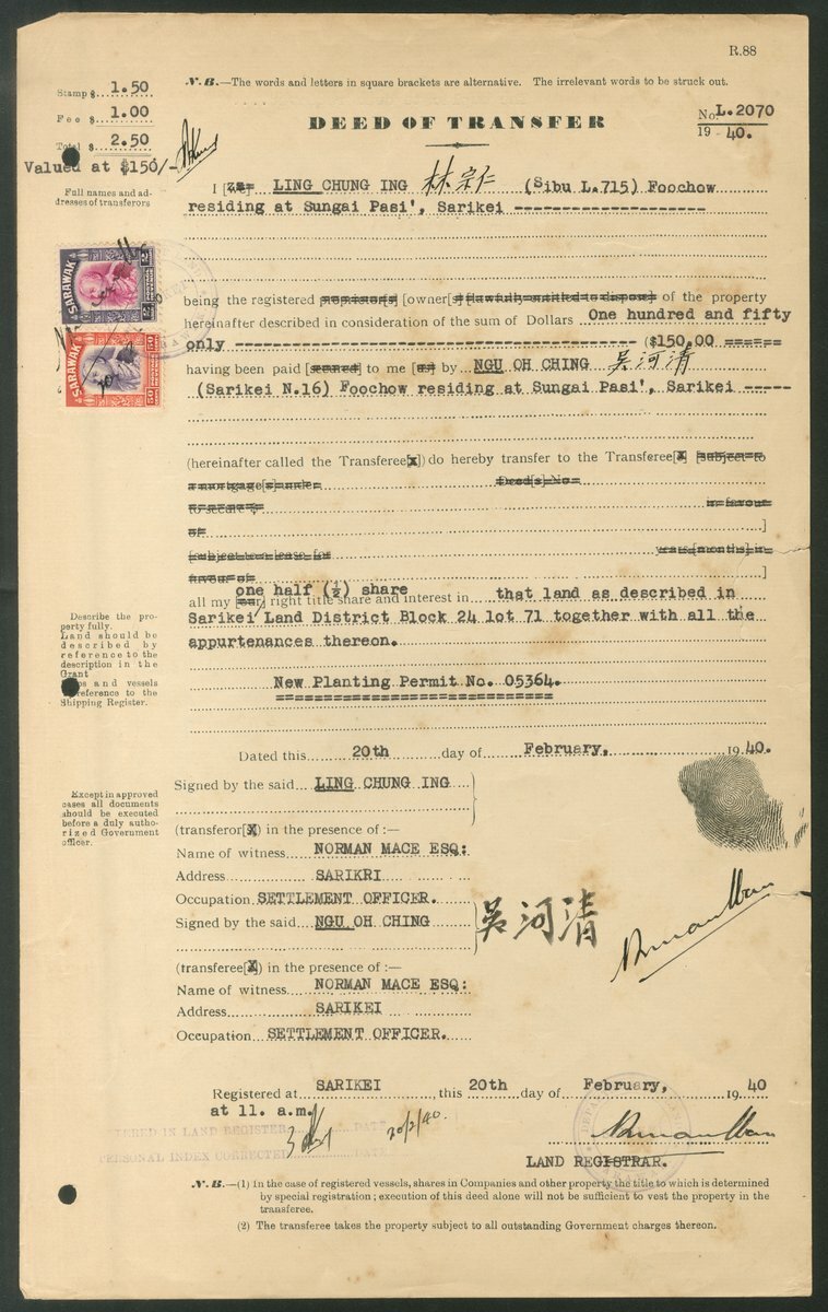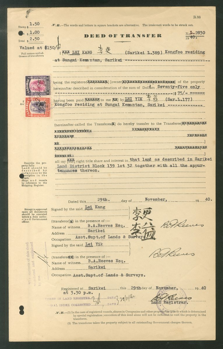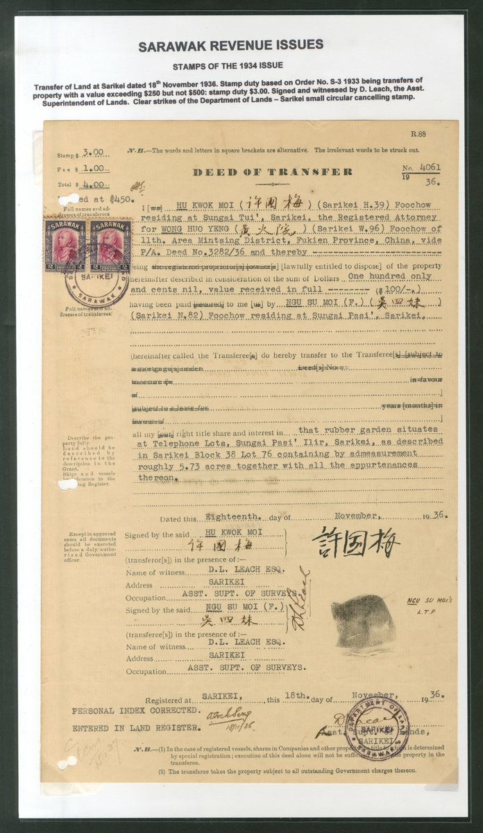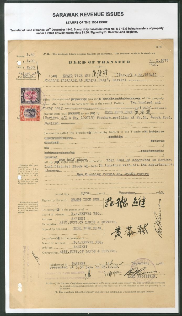 1936-40 Deeds of Transfer (8) for land at Binatang and Sarikei (7), showing frankings of $1.50, $2.50 (5) and $4; generally fine