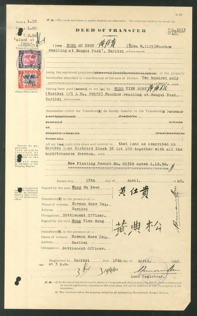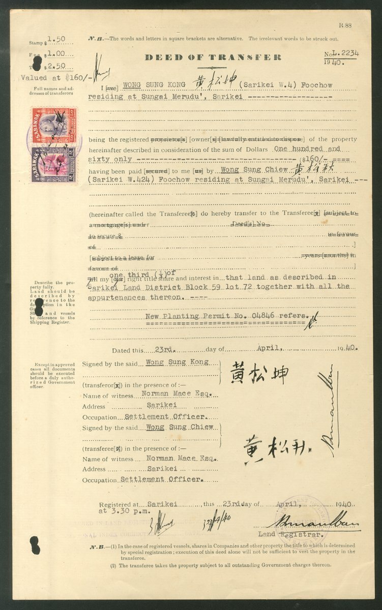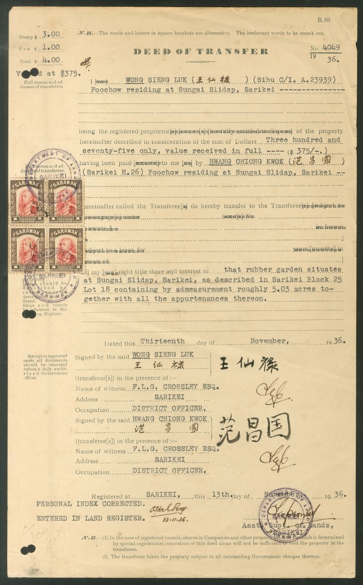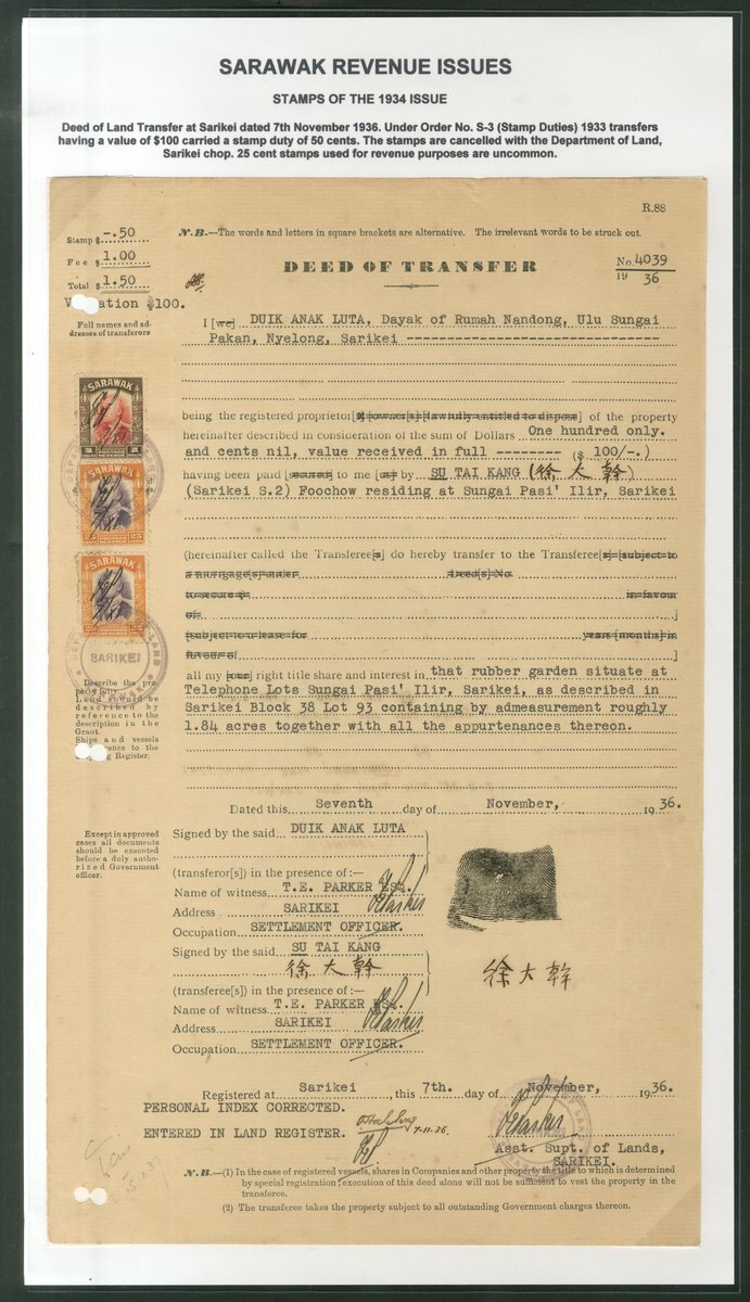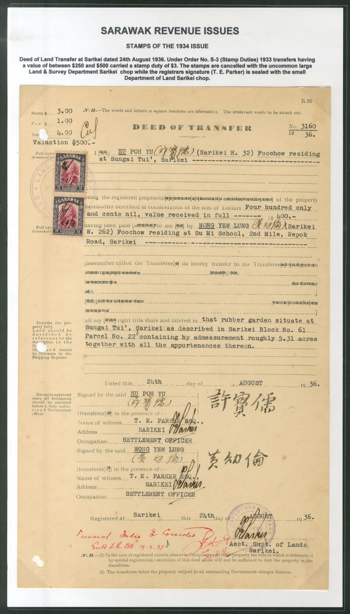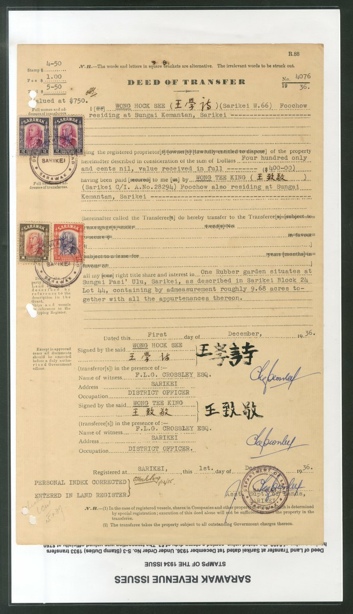 1936-40 Deeds of Transfer (8) for land at Sarikei, showing frankings of $1.50, $2.50 (2), $4 (4) and $5.50; generally fine