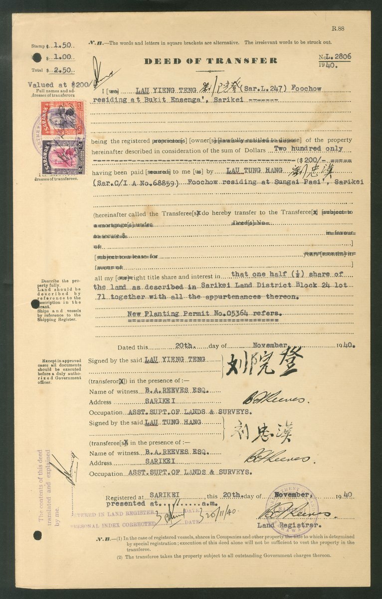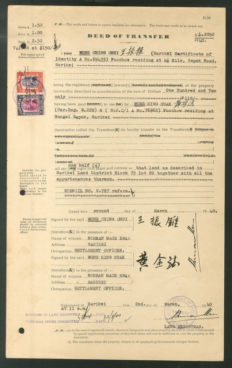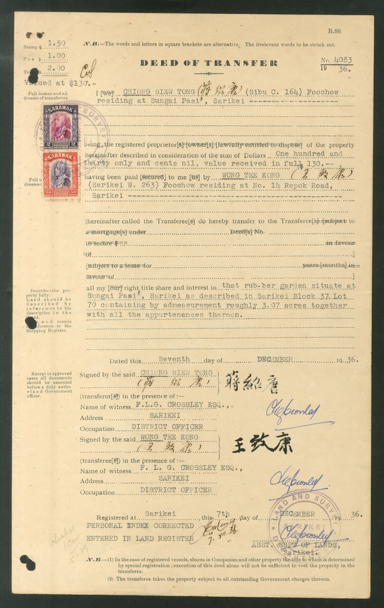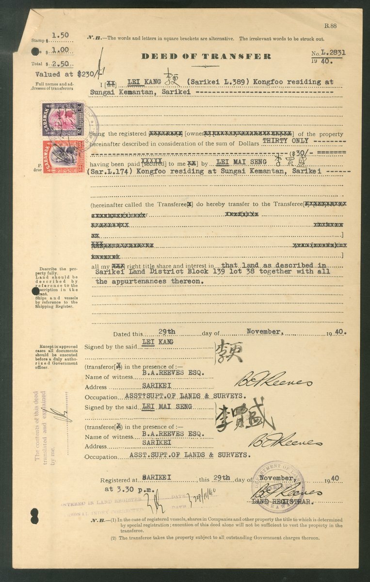 1936-40 Deeds of Transfer (8) for land at Sarikei, showing frankings of $1.50, $2.50 (5) and $4 (2); generally fine