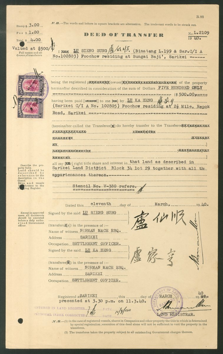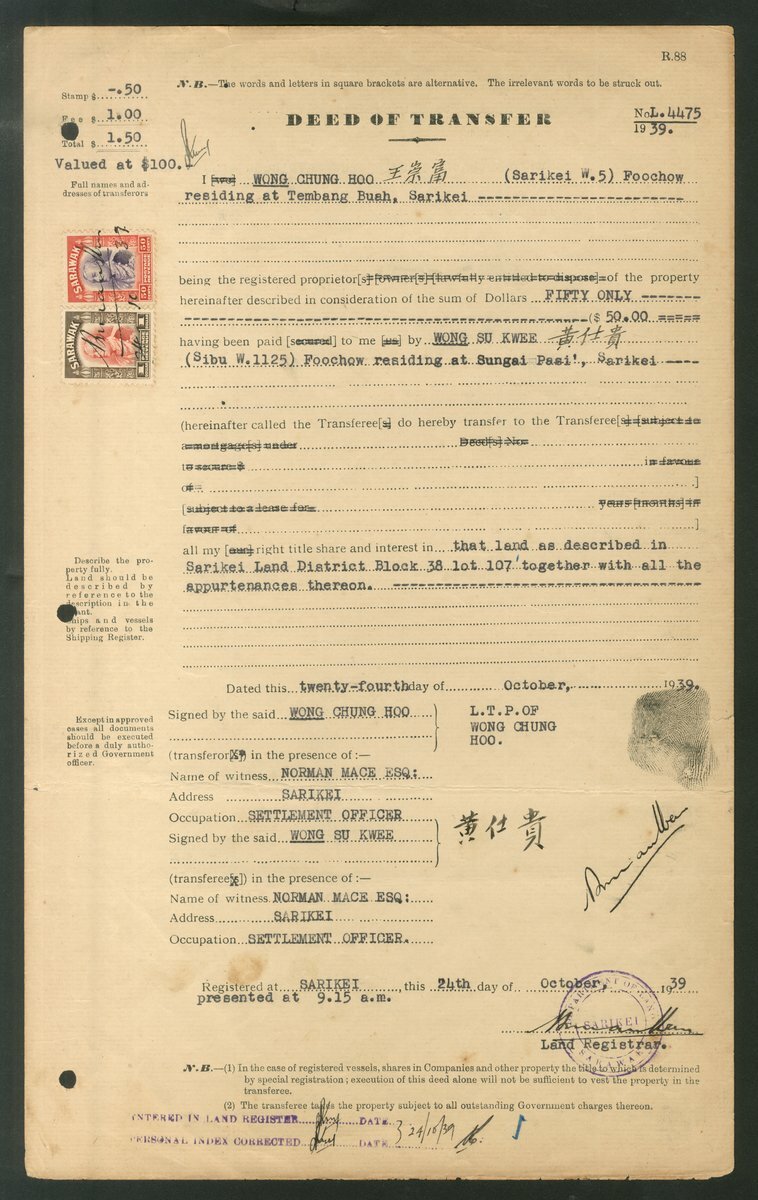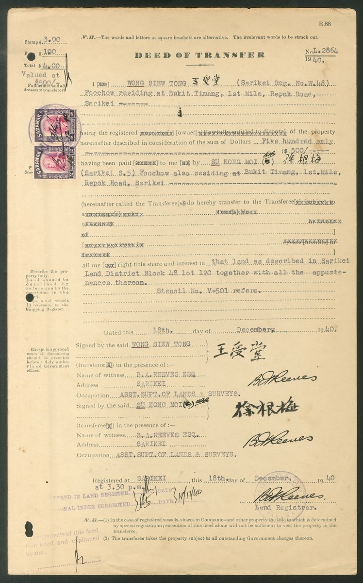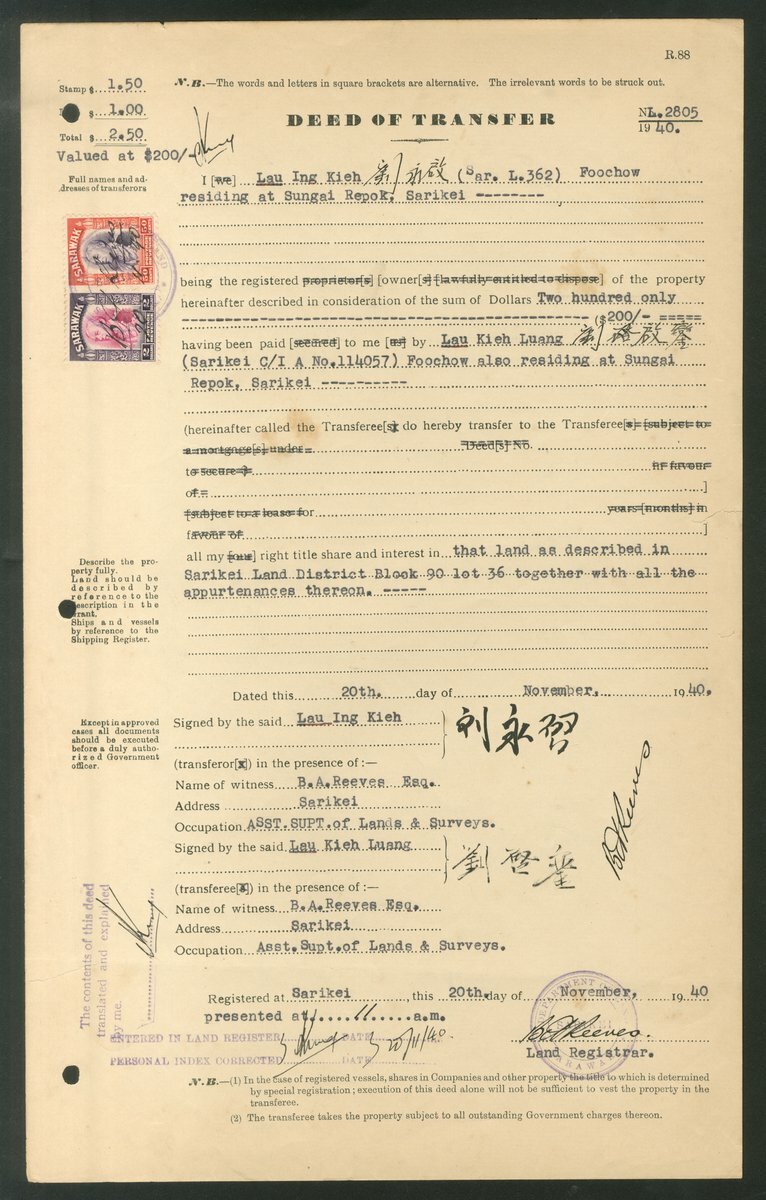 1936-40 Deeds of Transfer (8) for land at Sarikei, showing frankings of $1.50, $2.50 (5) and $4 (2); generally fine