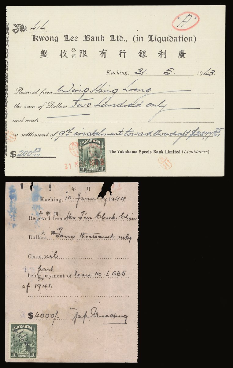 1943 (31 May) Kwong Lee Bank Ltd. receipt bearing 3c. with small seal tied by firm's straight-line datestamp and small Japanese chop, both in red; and 1944 (10 Jan.) receipt (faults) for the repayment of loan bearing unoverprinted 3c. cancelled by manuscript date. A fine pair illustrating the 1934 issue stamps were being used without Japanese overprints at the same time as overprinted stamps