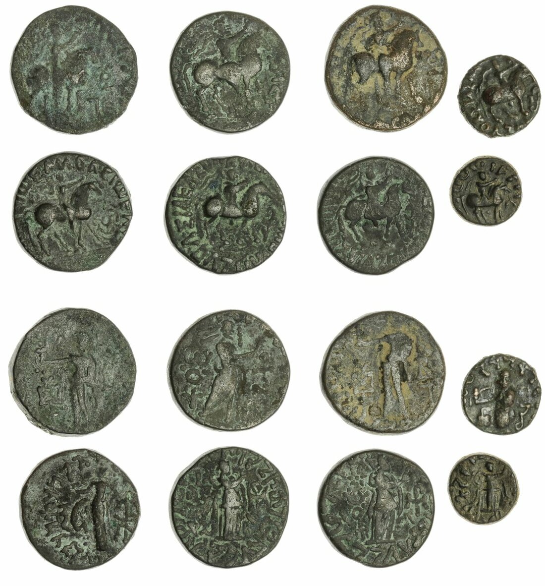 Indo-Scythian, kings of Bactria, Azes (c.58-12 BC), later base Tetradrachm, Drachms (2), Posthumous, Apracharajas (c. AD 1 - 30s), base Tetradrachms (5), horseman right, rev. various deities, the first about fine, the Drachms fine, the Apracharaja coins all with attractive toning, good fine or better (8)