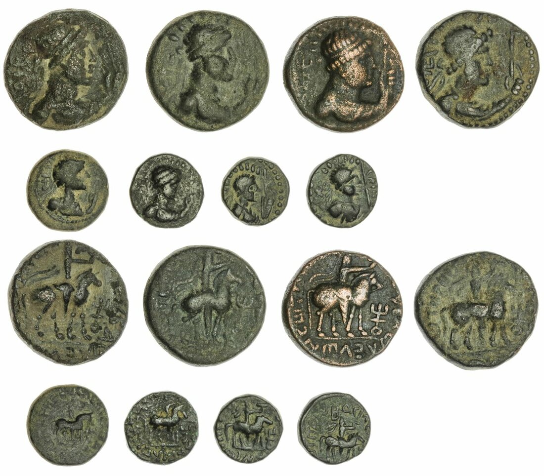 Kushan Empire, Vima Taktho (Soter Megas) (c. AD 55-100), AE Tetradrachms (4), Drachms (4), radiate bust right / horseman right, all different variants (MAC 2928-3002 for type), good fine to very fine, the Drachms particularly good for type (8)