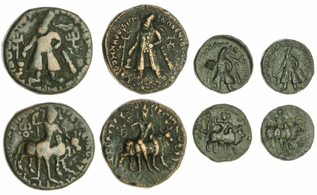 Kushan Empire, Vima Kadphises (c.113-127), AE Tetradrachms (2), Drachms (Quarter Units) (2), king standing left, making sacrifices at an altar, trident to left, club to right, legend around, rev. Siva standing facing, before bull Nandi, Buddhist triratana in left field above, Kharoshthi legend around (MAC 3008-58), fine to very fine (4)