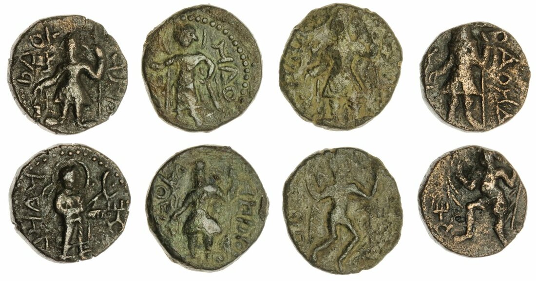 Kushan Empire, Kanishka I (c.127-50), AE Quarter-Units (4), king standing left, making sacrifices at an altar, trident to left, rev. deities of the Kushan pantheon: Mao, Nanaia, and Vado running left and right (MAC 3158-89 for type), selected for clarity of design, about very fine to very fine (4)
