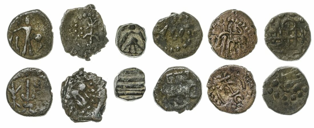 Post Kushan, Punjab, Kota-Bala (c.360-460), AE Units (6), standing figure derived from that of Vasu Deva on Kushan coins, or Brahmi legend 'kota' / Siva and bull Nandi, with collectors tickets (MAC 3666-3782), about fine to very fine (6)