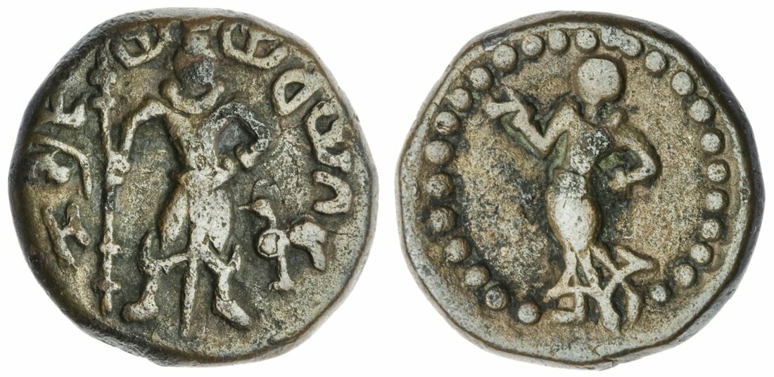 Ancient India, Yaudheya (c. 3rd century), AE Unit, early series, division 1, god Karttikeya standing facing holding a sceptre, cockerel on right, Brahmi legend yaudheya ganasya jaya (victory to the Yaudheya people), rev. goddess Devasena, standing left, feet between beads of border (MAC - ; Pieper 1125), unusual, as the emblem of Karttikeya is normally a peacock, very fine, scarce