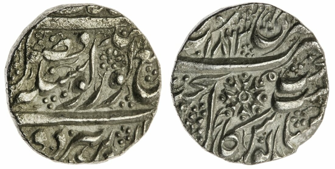 Sikh Empire, Ranjit Singh (VS 1856-96; 1799-1839), Arsishahi Rupee, Amritsar, VS 1863, leaf on reverse with arsishahi (flower-like mirror) symbol (Herrli 01.16.04; KM 20.6), minor edge fault and a couple of porous surface areas, overall crisp extremely fine, scarce