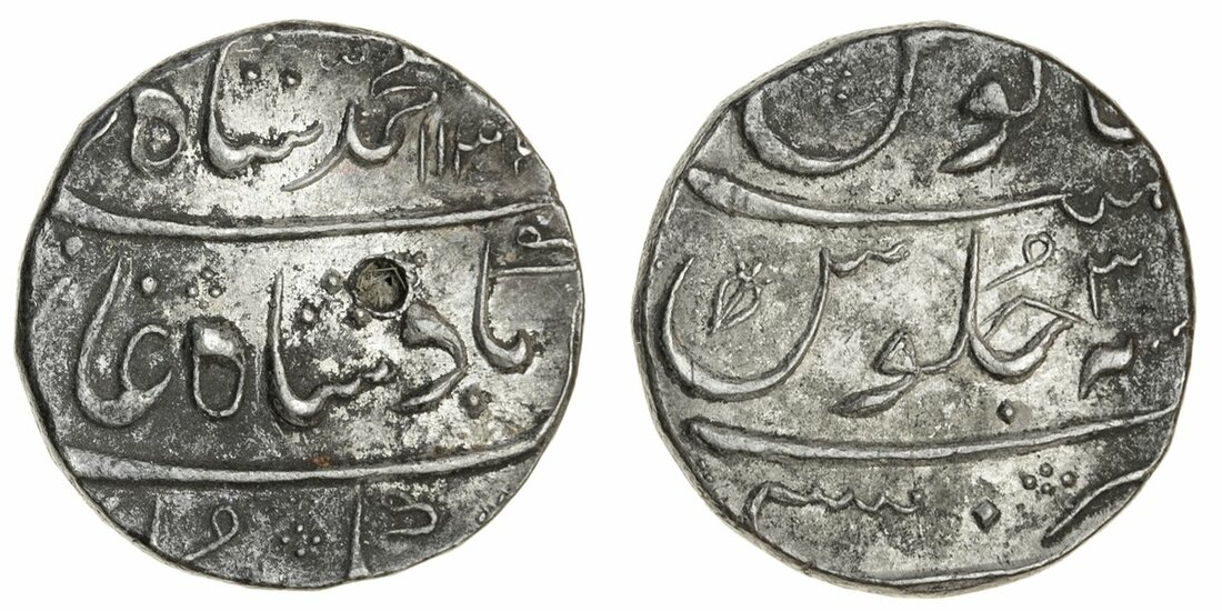 East India Company, Bombay Presidency, in the name of Muhammad Shah (1719-48), Rupee, Mumbai, ry.3, mint mark 3 (Stevens 2.19; KM 163; Pr. 35), one obverse test punch, otherwise toned about extremely fine, rare date
