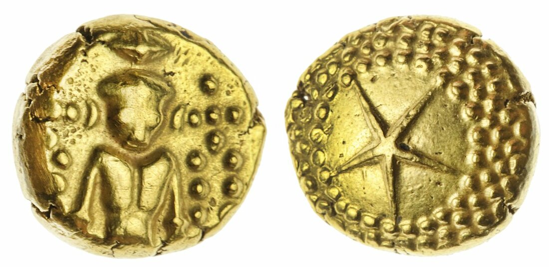 East India Company, Madras Presidency (c. 1740-1806), gold Star Pagoda, 3.35g, single half-length deity, rev. star on granulated surface (Pr. 9; KM 303; Stevens 1.11), a few edge cracks and small filed area, good fine