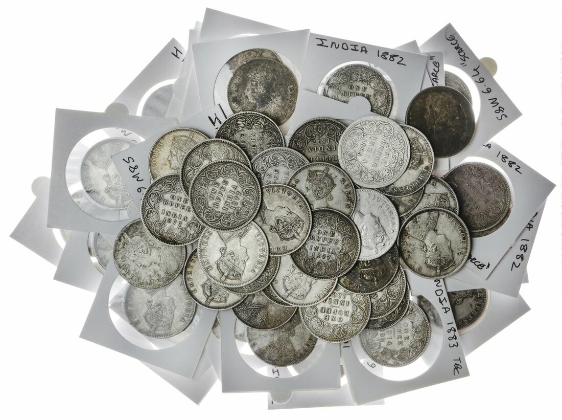 British India, Victoria, Rupees, 1862 (4) (issued 1862-75), without beads on reverse (2), two beads at top, C / II, four beads at bottom, H / II, 1974B, 1875C (2), 1877C (7), 1877B (10 - three different types), 1878C (5), 1878B (7), 1880C (6), 1880B, 1882C (2), 1882B (13),1883B (2), 1885B (3), 1886B, 1901B (S & W 4.51, 4.62, 4.74, 5.7, 5.12, 6.29, 6.33, 6.35, 6.37, 6.40, 6.51, 6.54, 6.61, 6.64, 6.71, 6.85, 6.93, 6.162 ; Pr. 66, 71, 79, 113, 115, 116, 118, 120, 142, 150, 151, 160, 164, 168, 171, 187), about very fine or better, a good selection of different dates and types (65)