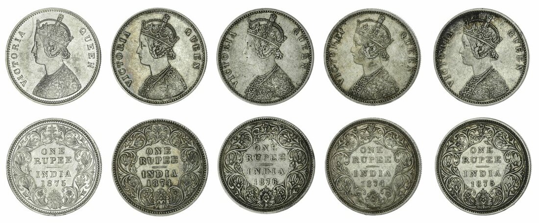 British India, Victoria, Rupees (5), Victoria named as Queen, 1874C, 1874B, 1875C, 1875B (bead), 1876B (bead) (S & W 5.5, 5.7, 5.12, 5.16, 5.20; Pr. 112, 113, 142, 146, 147), very fine to extremely fine, most scarce (5)