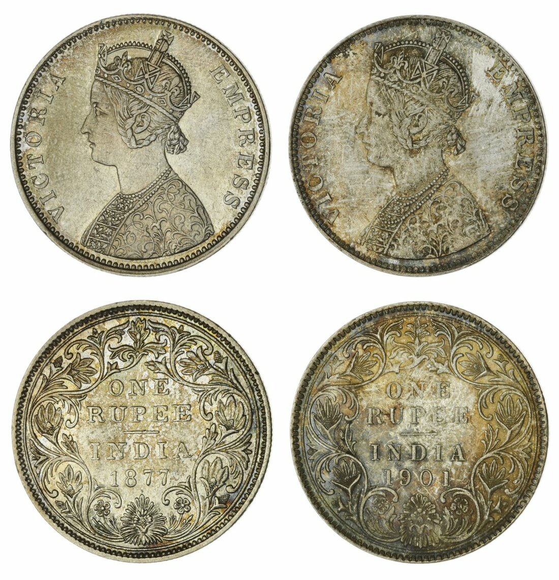 British India, Victoria, Rupees (2), Bombay mint, 1877, bust left with 3.75 panels in jabot, both 'v' and crescent on base line of bust, bead above flower on reverse, 1901, bust with 3.3 panels in jabot and no 'v' or crescent (S & W 6.35 var, 6.164; Pr. 143 var, 188 var), with original envelopes from Puddester sale, the first extremely fine, reverse better, a rare variant, the second toned, good very fine (2)