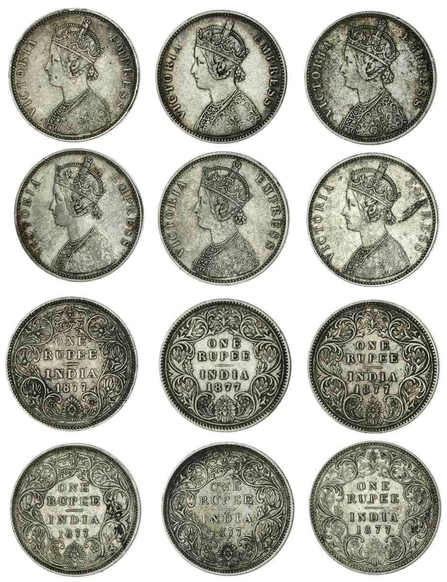 British India, Victoria, Rupees (6), Victoria named as Empress, 1877C ( A1 / I), 1877B (bead, A3 / I), 1877B (bead, A2 / I, no 'v'), 1877B (3) (bead, A2, A3, all rev. II, but one with 6 petals to lower left flower in wreath) (S & W 6.29, 6.32, 6.33, 6.35, 6.35a; Pr. 115, 149, 150), generally very fine, a good range of types, some scarce (6)