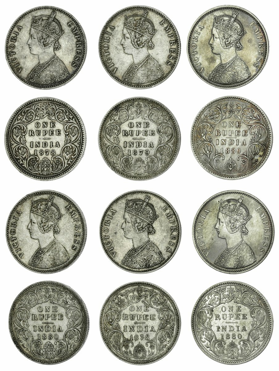 British India, Victoria, Rupees (6), Victoria named as Empress, 1878C (A1 / I), 1878B (bead, A3 / II), 1879C (A1 / I), 1880C ( A1 / I), 1880B (bead, A3 / I), 1880B (bead, A2 / III, 3 petals to lower left flower in wreath) (S & W 6.37, 6.40, 6.45, 6.51, 6.52, 6.54; Pr. 116, 117, 118, 151, 156, -), generally very fine, the last two about extremely fine, a good range of types (6)