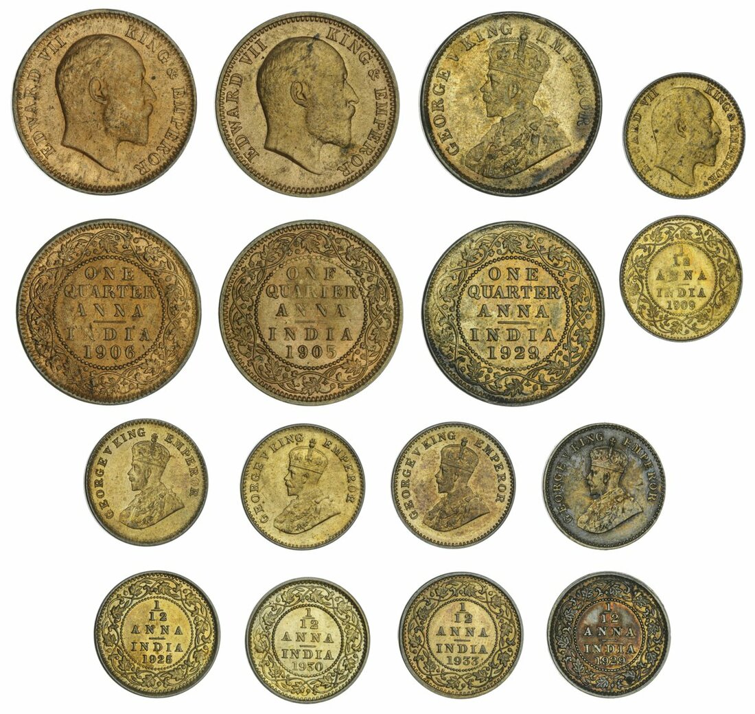 British India, Edward VII & George V, choice AE coins (8), Quarter-Annas (3), 1905, 1906, 1929, 1/12-Annas (5), 1909, 1925, 1929, 1930, 1933, all Calcutta mint (S & W) 7.165, 7.168, 7.227, 8.371, 8.558, 8.575, 8.577, 8.583: Pr. 649, 650, 670, 825, 839, 843, 844, 847), generally uncirculated, or nearly so, with original lustre, as struck (8)