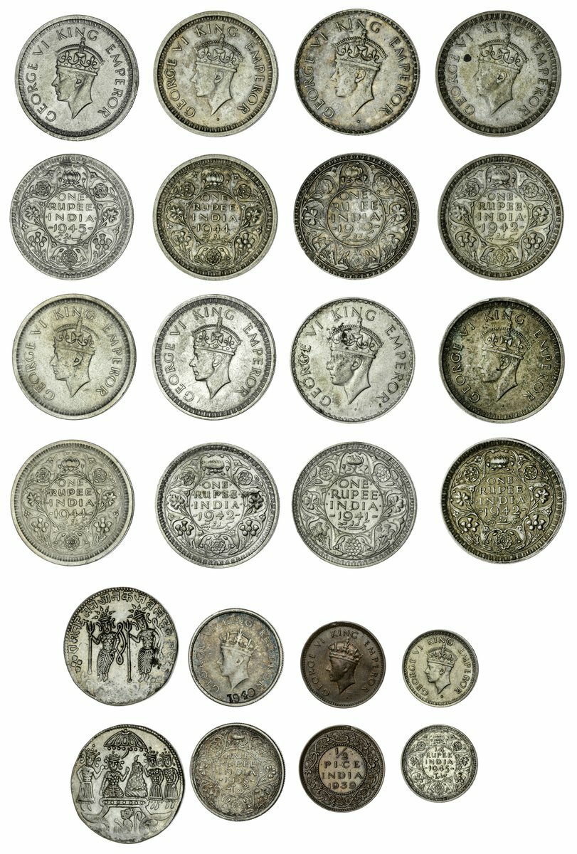 British India, George IV (1938-52), Rupees (8), 1940B, 1941B, 1942B (4), 1944L, 1945L, Half-Rupee, 1938B, Quarter-Rupee, 1945B (large 5), AE Half-Pice, 1939B, together with a Ramatanka token (S & W 9.17, 9.18, 9.20, 9.28, 9.34, 9.43, 9.100, 9.258; Pr. 237, 238, 240, 247, 248, 351, 479, 773), mostly extremely fine or nearly so, the Quarter-Rupee with large 5 scarce (12)