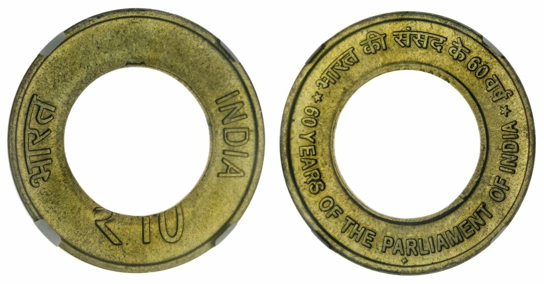 India, Republic, bi-metal 10-Rupees, 2012, commemorating 60 years of the Indian Parliament, mint error, struck without central insert, graded by NGC MS 66 (4862764-010), unusual and rare