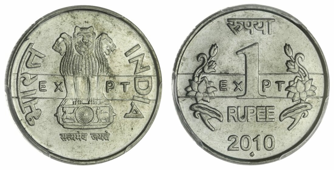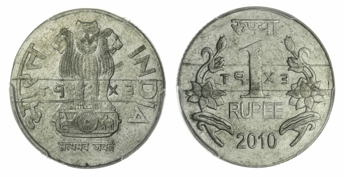India, Republic, steel experimental pattern 2- Rupees, 2010 H, Hyderabad, Rupee, 2010 B, Mumbai, Ashoka lion capital, EX PT between parallel lines across, rev. value above date between two floral sprays, EX PT between parallel lines across, Rupee 2010 C, Calcutta (no mint mark), similar to previous coin but TP XE (letters reversed) both sides, graded by PCGS, the first two SP 64, the last SP63 (80294936, 80294915, 8029871) (3)