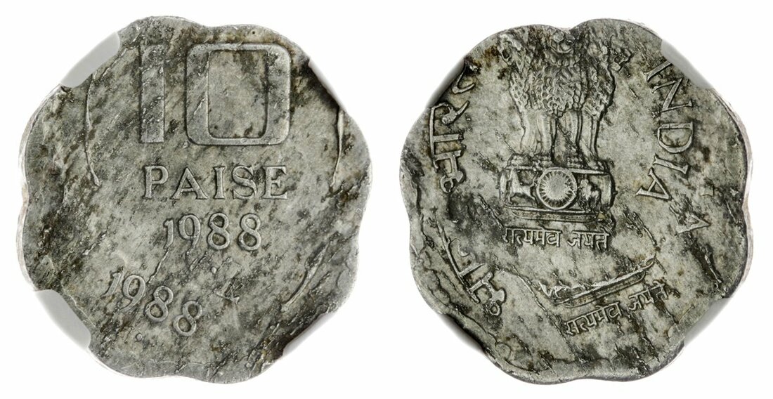 India, Republic, 10-Paisa, 1988B, mint error, double struck both sides, partially off flan (KM 39), graded by NGC MS 61 (4862764-004)