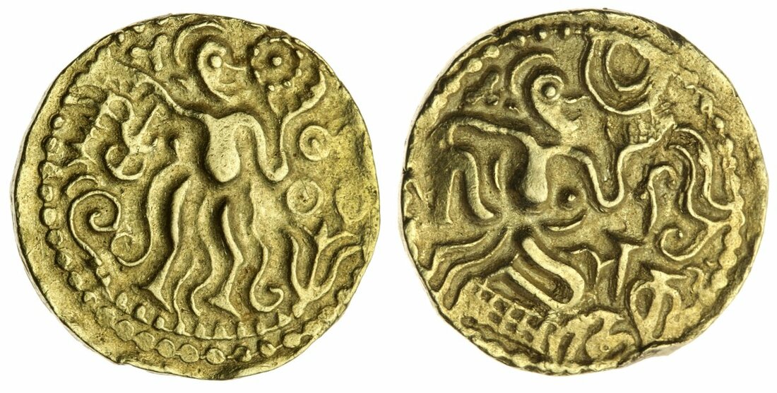 The metallic composition of this particular coin is uncertain, although XRF tests of similar type II (1) coins have shown they contain under 60% of gold, up to 40% of silver and a tiny amount of copper.