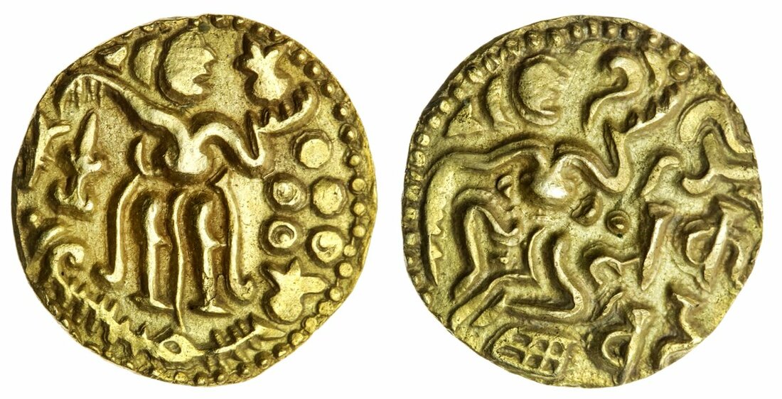 Sri Lanka (Ceylon), Anonymous (c.960-1214), gold Kahavanu, 4.32g, type III (B), Jasmine flower and chank (conch), standing figure of Ceylon style, two symbols under arm in left field, holding jasmine bud right, four annulets below right with one solid pellet above, beneath feet a line connecting a conch on left and jasmine bud on right, rev. figure seated right on an asana (low throne), holding a conch, Devanagari legend in right field Sri Lamka Vibhu (fortunate lord of Sri Lanka) (Codrington 53; Mitchiner, Southern India, part 2, 311-2), tine file mark above standing figure on edge, about extremely fine