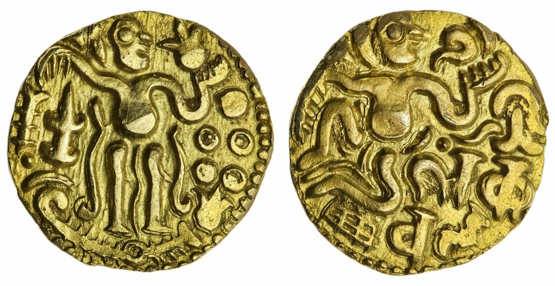 Sri Lanka (Ceylon), Anonymous (c.960-1214), gold Kahavanu, 4.33g, type III (B or C), Jasmine flower and chank (conch), standing figure of Ceylon style, two symbols under arm in left field, holding jasmine bud right, four annulets below right with one solid pellet above, beneath feet a line connecting a conch on left and jasmine bud on right, rev. figure seated right on an asana (low throne), holding a conch, Devanagari legend in right field Sri Lamka Vibhu (fortunate lord of Sri Lanka) (Codrington 53-54; Mitchiner, Southern India, part 2, 311-2), fine style, tiny file mark on edge above standing figure, extremely fine