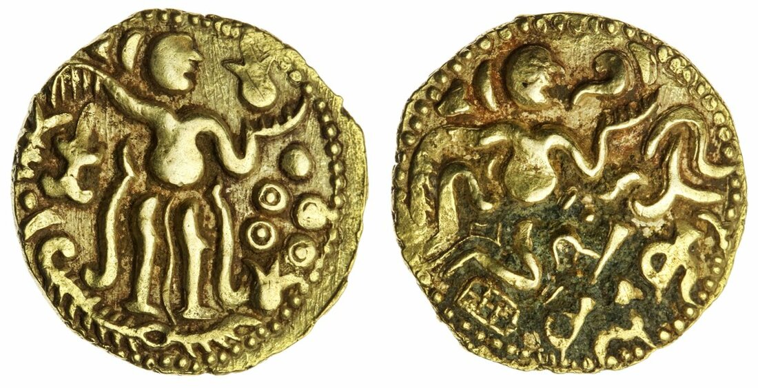 Sri Lanka (Ceylon), Anonymous (c.960-1214), gold Kahavanu, 4.39g, type III (C), Jasmine flower and chank (conch), standing figure of Ceylon style, two symbols under arm in left field, holding jasmine bud right, four annulets below right with one solid pellet above, beneath feet a line connecting a conch on left and jasmine bud on right, rev. figure seated right on an asana (low throne), holding a conch, Devanagari legend in right field Sri Lamka Vibhu (fortunate lord of Sri Lanka) (Codrington 54; Mitchiner, Southern India, part 2, 311-2), good very fine