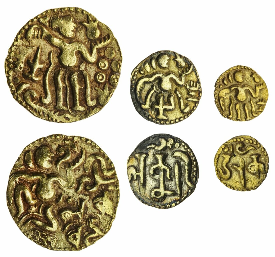Sri Lanka (Ceylon), Anonymous (c.960-1214), gold Kahavanu, type III (B), gold Pala (Quarter-Kahavanu), legend a stylised form of Lakshmi, gold Aka (Eighth-Kahavanu), similar, but with legend believed to read daraka, all Jasmine flower and chank (conch) types, (Codrington 53, 62, 67-8; Mitchiner, Southern India, part 2, 311-317), generally very fine or a little better (3)