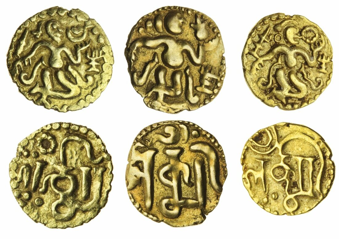 Sri Lanka (Ceylon), Anonymous (c.960-1214), gold Pala (Quarter-Kahavanu) (3), standing figure holding an adahanda, 1.04g, an open lotus, 1.09g, and a jasmine flower, 0.99g, respectively (type II (1, 2), type III (B), rev. legend a stylised form of Lakshmi in Devanagiri, with open lotus, adahanda, and conch above (Codrington 56, 57, 62; Mitchiner, Southern India, part 2, 314), harder to find than the full Kahavanu coins, very fine to extremely fine (3)